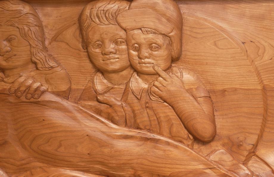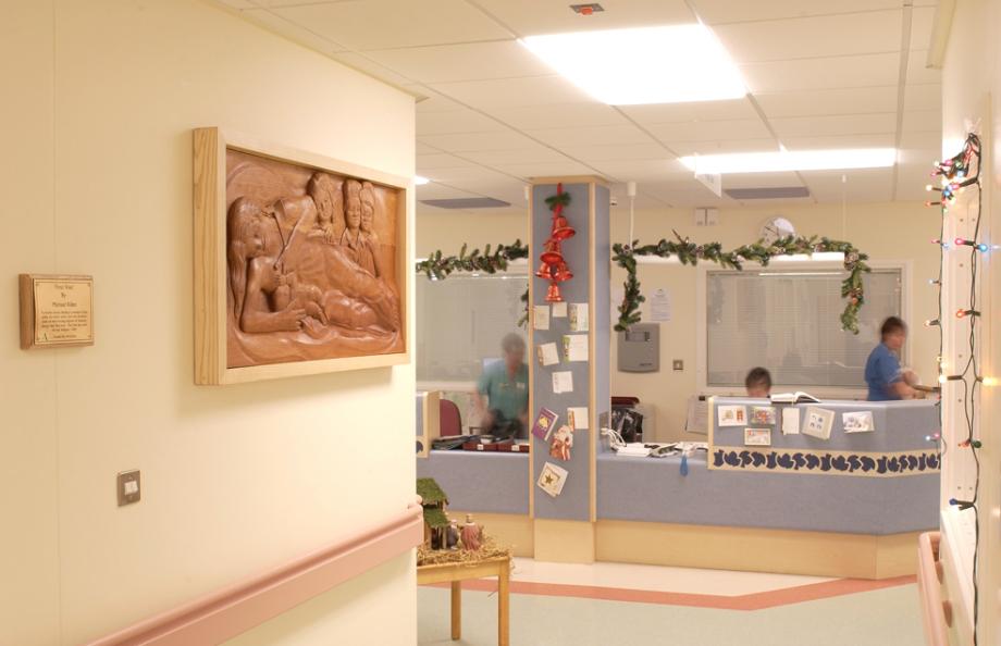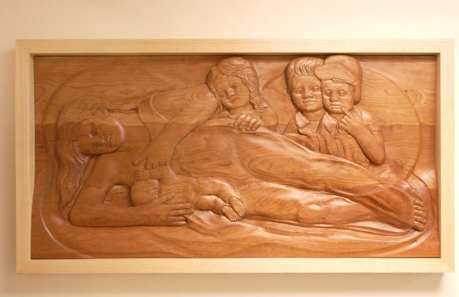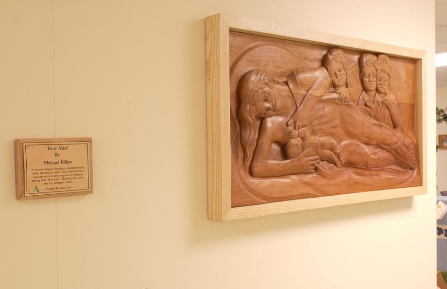This high relief is entitled ‘First Visit’. The sculpture was commissioned by Arts Care, Northern Ireland on behalf of the Northern Ireland Health Service and secured through open competition. The panel is located in the Maternity Unit of the new Causeway Hospital