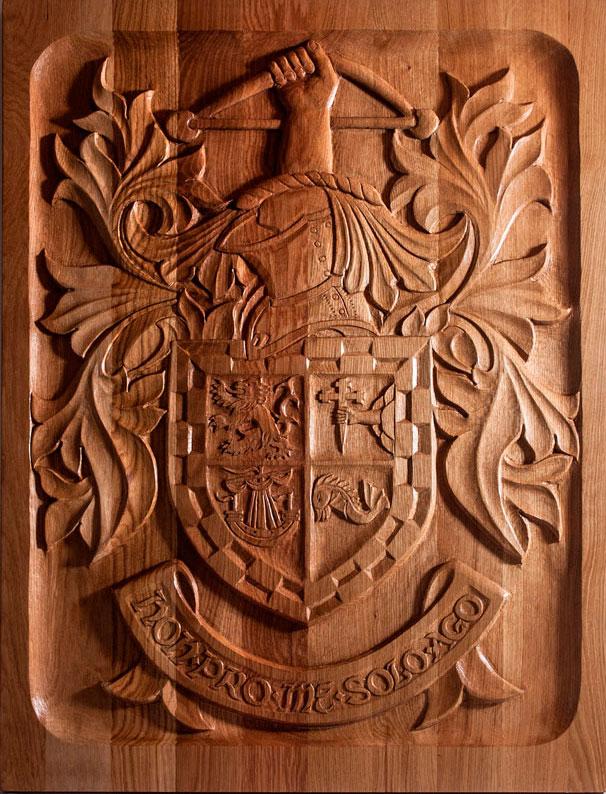 This Heraldic crest was commissioned in June of 2012. The symbols to be used on the shield were supplied by the client; The Mantling was designed in consultation with the client. The Crest is sculpted in American White Oak, it measures 1200 mm x 920 mm x 60 mm.