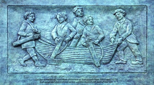 The relief depicts boat that was once used to take golfers from a slipway in Malahide to their Island Golf Course across the outer estuary. The bronze is located on the 13th Tee, the location of the former Club House. It measures roughly 76 cms x 54 cms and is mounted on a granite stone.